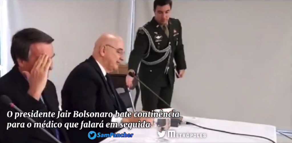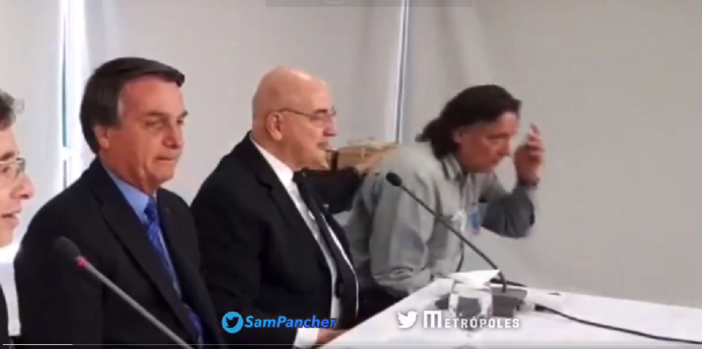 Tratado com deferência especial, o virologista Paolo Zanoto parece ter intimidade com Bolsonaro. O presidente faz questão de que ele saia da plateia e se sente ao seu lado. Para cumprimentá-lo, o presidente da República bate continência.