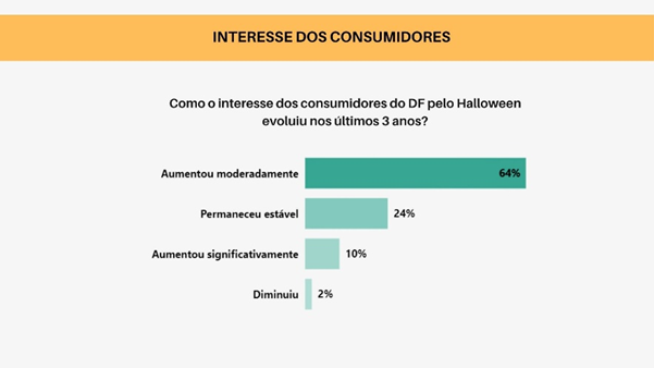 Cerca de 64% dos comerciantes entrevistados afirmaram que o interesse dos consumidores pelos itens de Dia das Bruxas aumentou moderadamente nos últimos três anos. Outros 24% informaram que o interesse permaneceu estável, 10% registraram um aumento significativo e 2% relataram diminuição. Para 2025, estima-se que o ticket médio por cliente ficará entre R$ 51 e R$ 100.