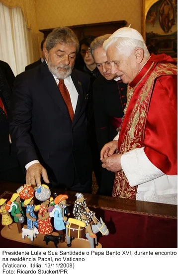 O presidente esteve com Bento XVI em duas ocasiões — uma durante a visita do papa ao Brasil, em 2007, e outra no Vaticano, em novembro de 2008. Já com Francisco, Lula manteve contato próximo, incluindo uma audiência nos primeiros meses de seu atual mandato.