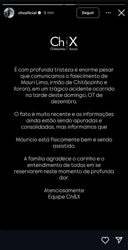 “É com profunda tristeza e enorme pesar que comunicamos o falecimento de Mauri Lima, irmão de Chitãozinho e Xororó, em um trágico acidente ocorrido na tarde deste domingo. O fato é muito recente e as informações estão sendo apuradas e consolidadas, mas informamos que Maurício está fisicamente bem e sendo assistido. A família agradece o carinho e o entendimento de todos em se reservarem neste momento de profunda dor”, diz o comunicado.