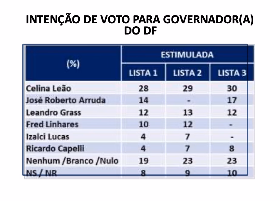 O levantamento mostra um empate triplo pelo segundo lugar, com o ex-governador José Roberto Arruda (14%), o presidente do Iphan e ex-candidato ao GDF Leandro Grass (12%), e o deputado federal Fred Linhares (10%). No terceiro grupo aparecem o senador Izalci Lucas (PL) e o ex-interventor federal Ricardo Capelli (PSB), ambos com 4%. Indecisos, brancos e nulos somam 27% do eleitorado.