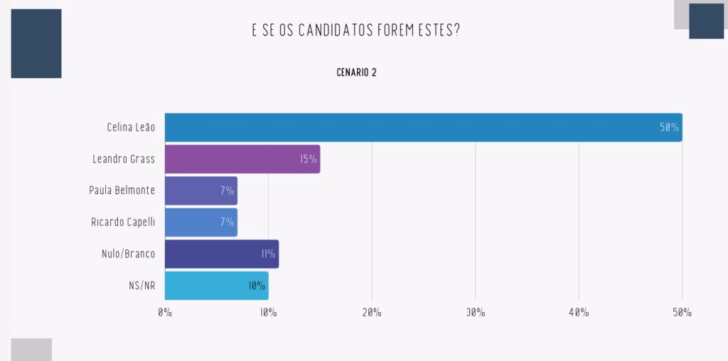 No segundo cenário, sem a presença de Arruda, Celina Leão amplia ainda mais sua vantagem e chega a 50% das intenções de voto, mais que o triplo de Leandro Grass, que registra 15%. Paula Belmonte e Ricardo Cappelli aparecem com 7% cada, enquanto 11% declararam voto nulo ou branco e 10% não souberam responder.