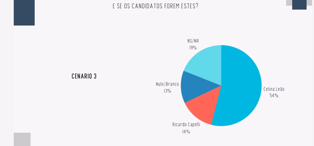 Já no terceiro cenário, em um confronto direto entre Celina Leão e Ricardo Cappelli, a vice-governadora atinge 54% das intenções de voto, consolidando-se como a candidata mais competitiva do momento. Cappelli marca 14%, enquanto 13% afirmaram que votariam em branco ou nulo, e 19% não souberam ou preferiram não responder.