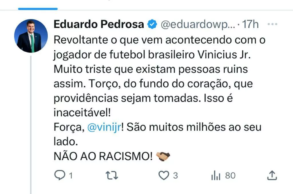 “É revoltante o que vem acontecendo com o jogador brasileiro Vinicius Jr. É muito triste que ainda existam pessoas ruins assim. Torço, do fundo do coração, para que providências sejam tomadas. Isso é inaceitável. Força, @vinijr! São muitos milhões ao seu lado, não ao racismo”, declarou Pedrosa.
