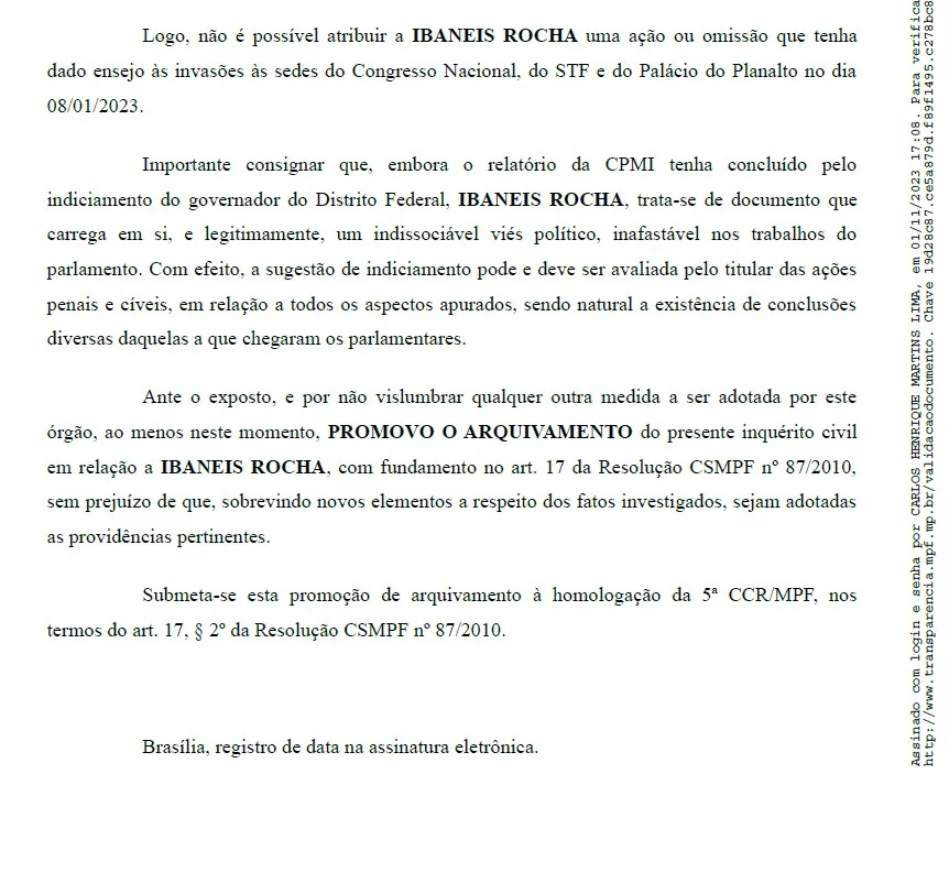 Na conclusão do documento, Martins Lima inocentou Ibaneis Rocha ao arquivar o inquérito relativo às ocorrências do dia 8 de janeiro de 2023. O procurador ressaltou que, caso surjam novos elementos a respeito dos fatos investigados, serão adotadas as providências pertinentes, em conformidade com a Resolução CSMPF nº 87/2010.