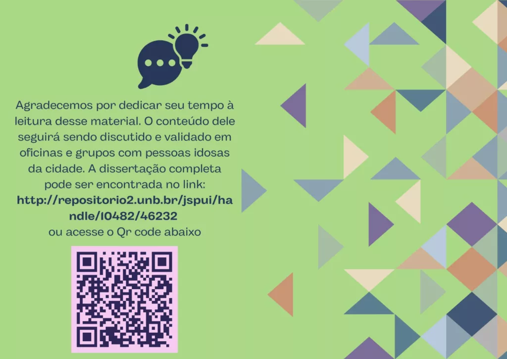 A dissertação, elaborada pela experiente assistente social Weila Almeida, ex-colaboradora do Sesc-DF, em parceria com o Grupo de Pesquisa “Envelhecer Cidadão” da UnB, encontra-se disponível para acesso através de um QR Code (acesse abaixo).