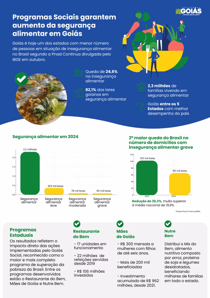 Atualmente, mais de 2,3 milhões de famílias goianas vivem em segurança alimentar, com acesso regular a refeições adequadas e de qualidade. O avanço representa um crescimento de 10,1% em relação a 2023 e reflete uma melhora significativa em todos os níveis de severidade da insegurança alimentar. O levantamento também aponta que Goiás obteve a segunda maior redução do Brasil no número de domicílios com insegurança alimentar grave — uma queda de 36,3%, muito acima da média nacional de 19,9%.