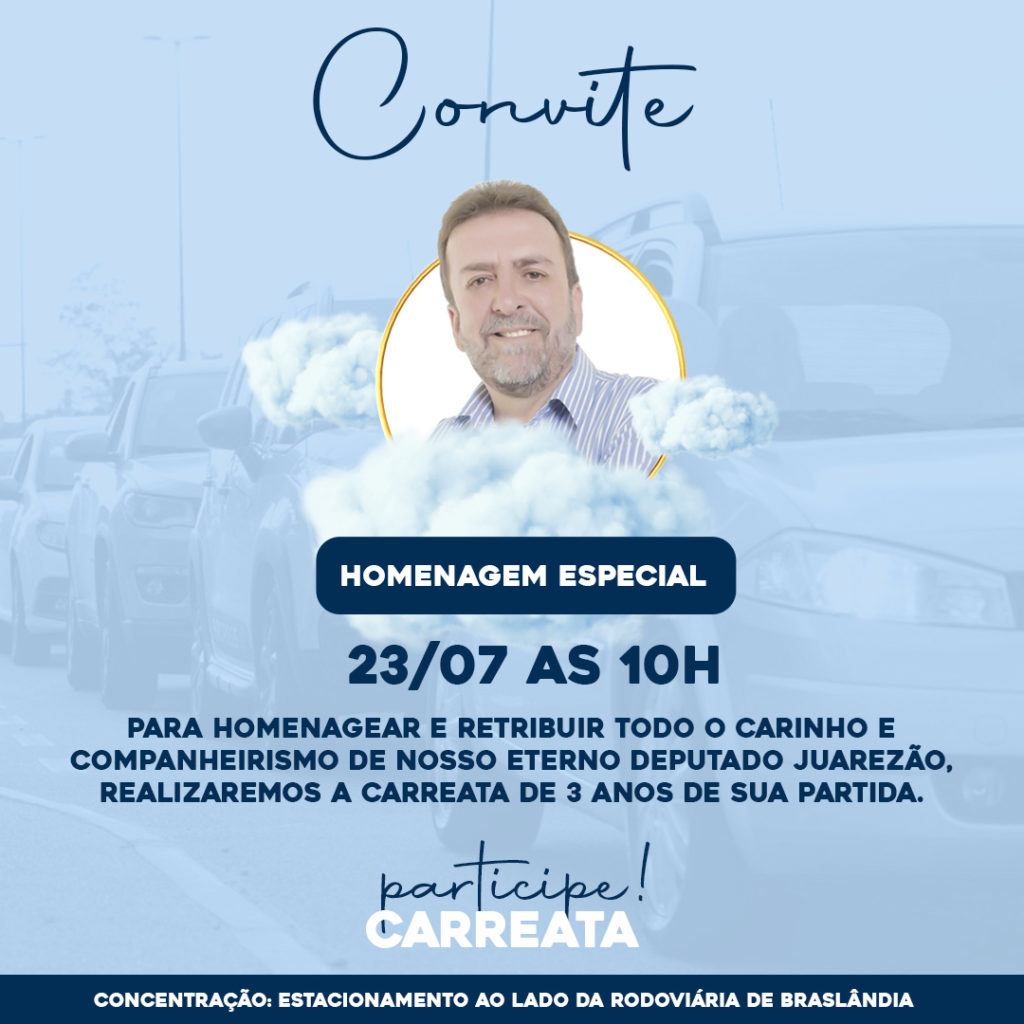 Em junho deste ano, Juarezão,  ex-deputado distrital, completou três anos de sua partida. Neste sábado, 23 de julho, os moradores de Brazlândia se reúnem, numa carreata em homenagem a uma das figuras públicas mais querida de Brazlândia, a partir das 10h da manhã. Juarezão ocupou uma cadeira na Câmara Legislativa do Distrito Federal de 2015 a 2018 e chegou a ser eleito como presidente da Casa.