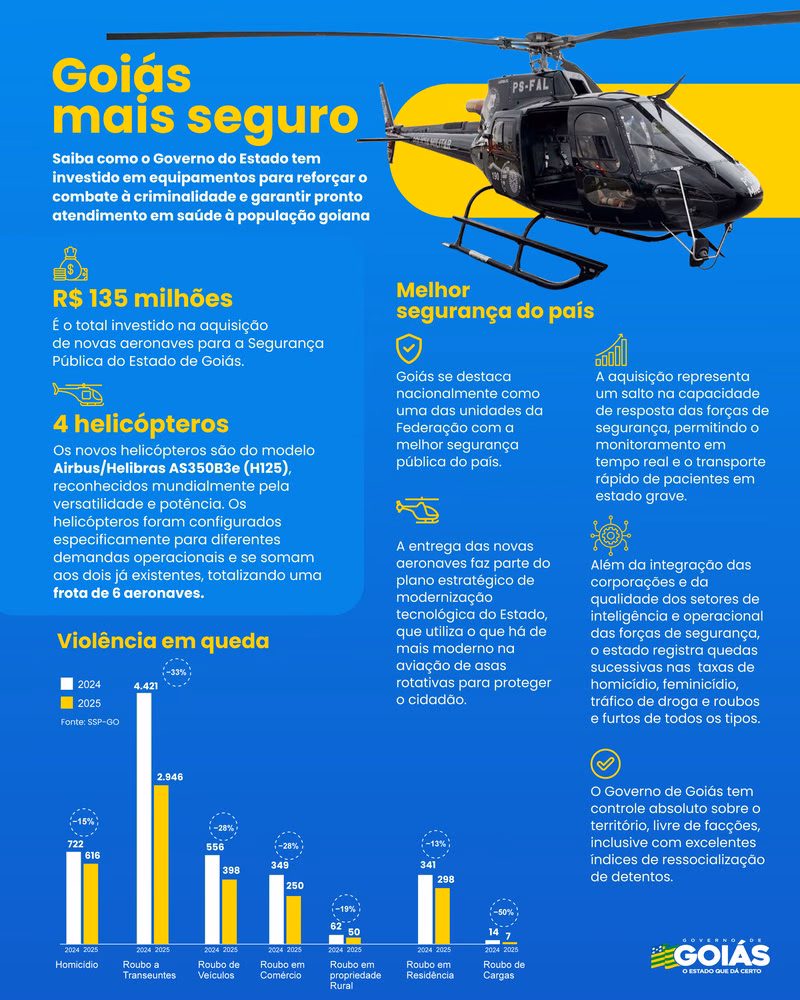 Do total, dois helicópteros foram destinados à Polícia Militar, um à Polícia Civil e outro ao Serviço Aéreo do Estado de Goiás (Saeg), responsável pela gestão e operação das aeronaves, além de missões de segurança pública, transporte, resgate e atividades institucionais.