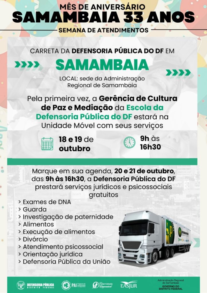 Uma semana repleta de serviços foi reservada para a comunidade de Samambaia, os atendimentos terão início no dia 18 de outubro e serão finalizados no dia 21. A última edição do evento alcançou números recordes de atendimentos, em comparação com outras regiões administrativas, a Carreta da Defensoria Pública, atendeu cerca de 700 pessoas que foram atendidas com apenas dois dias de serviços gratuitos disponíveis para a população.