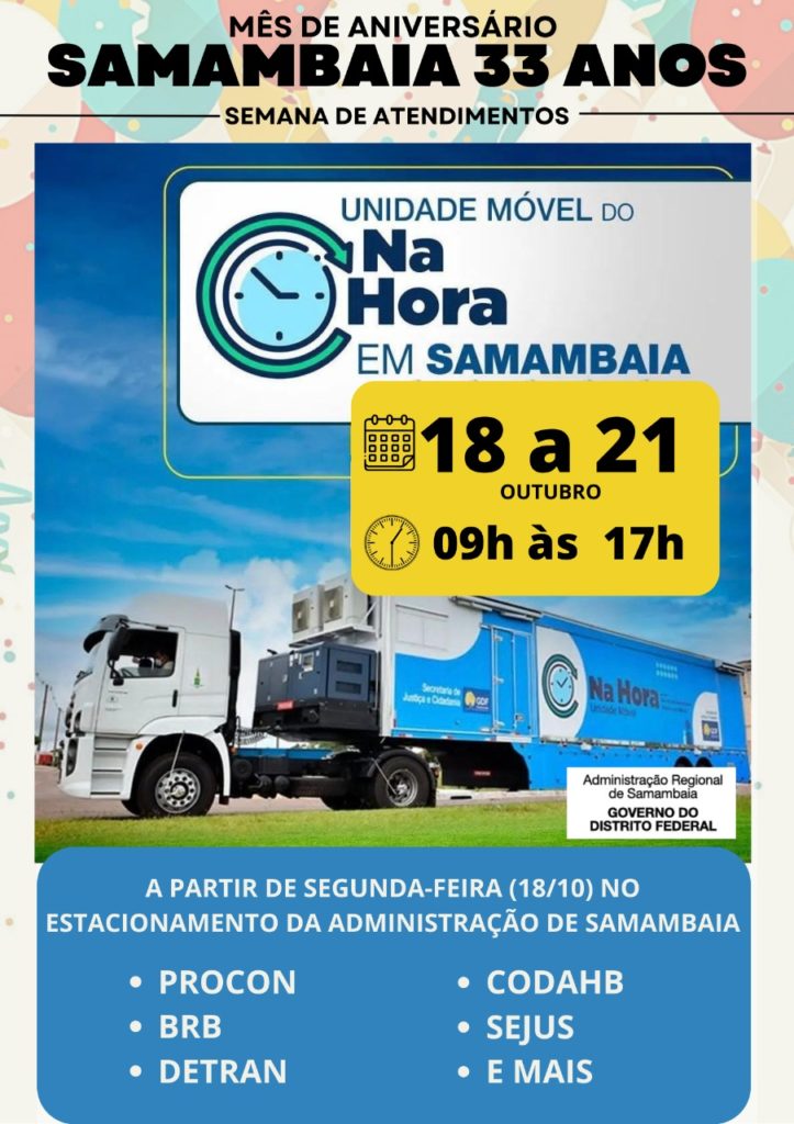 A carreta do Na Hora também estará presente no estacionamento da Administração de Samambaia dos dias 18 a 21 de outubro, das 09h às 17h realizando atendimentos. A carreta faz parte do programa Na Hora Mais Perto do Cidadão, promovido pela Secretaria de Justiça e Cidadania (Sejus). E contará com atendimentos do PROCON, BRB, DETRAN, CODHAB, SEJC, SEJUS e muito mais.