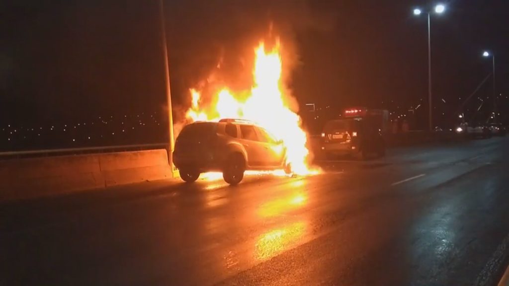 Um carro pegou fogo na noite de domingo (24) na Ponte JK, em Brasília. Segundo os bombeiros, ele ficou em chamas após bater na traseira de outro veículo, no sentido Plano Piloto, por volta das 19h.