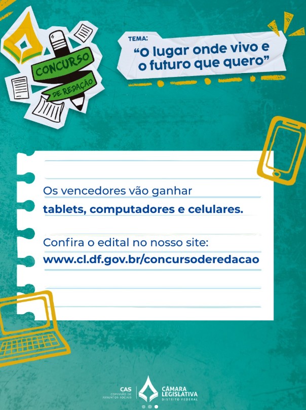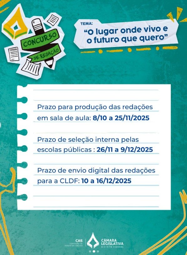 Promovido pela Comissão de Assuntos Sociais (CAS), presidida pelo deputado distrital, o concurso contempla duas categorias: estudantes do ensino fundamental (anos finais) e do ensino médio, incluindo o terceiro segmento da Educação de Jovens e Adultos (EJA).