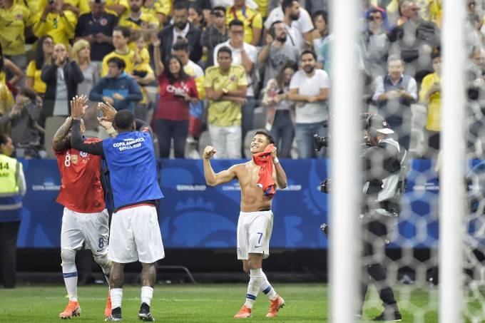 O atacante Alexis Sánchez, de 1,69m, não teve medo de encarar o zagueiro colombiano Yerry Mina, de 1,95m, mesmo com a gritante diferença de altura.