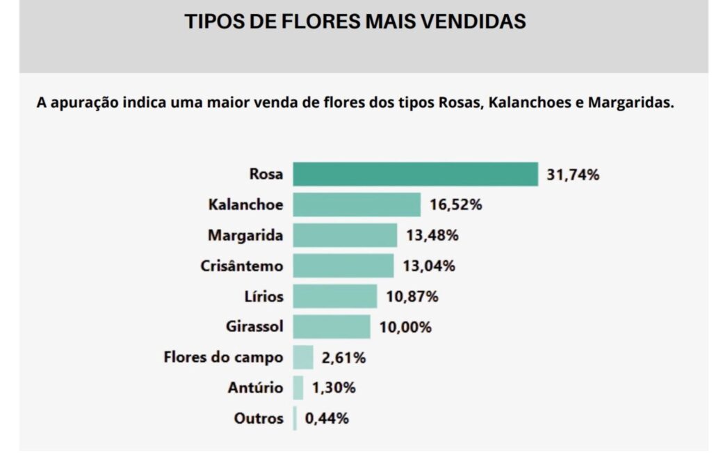As flores seguem como os principais produtos escolhidos pelos consumidores para prestar homenagens a seus entes queridos. A sondagem mostra que as rosas continuam liderando as vendas, representando 31,74% da preferência dos clientes. Em seguida aparecem as kalanchoes(16,52%), margaridas (13,48%), crisântemos (13,04%) e lírios (10,87%). Também se destacam as vendas de girassóis (10%), flores do campo (2,61%), antúrios (1,30%) e outros tipos de flores (0,44%).