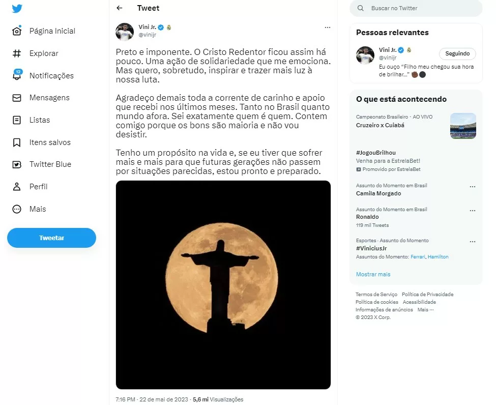 Vinícius Júnior se manifesta no Twitter em resposta ao gesto de solidariedade do Cristo Redentor, expressando gratidão pelo apoio e reafirma seu compromisso com a luta contra o racismo.