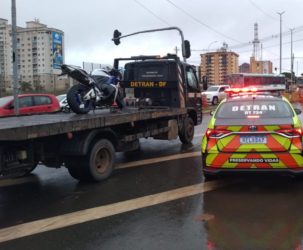 Na manhã desta quinta-feira (10/2), em Taguatinga Norte, equipes do Departamento de Trânsito do Distrito Federal (Detran-DF) flagraram um motociclista trafegando sem capacete. Ele tentou evadir-se da abordagem, mas não obteve êxito. Ao se aproximarem, os agentes de trânsito constataram que tanto o condutor quanto a passageira apresentavam sinais de embriaguez. Ele recusou-se a ser submetido ao teste do etilômetro. Além da falta do capacete e do odor etílico, os agentes do Detran-DF identificaram ainda que o motociclista está com o direito de dirigir suspenso e a motocicleta não está licenciada. O condutor foi autuado e o veículo foi removido ao depósito.