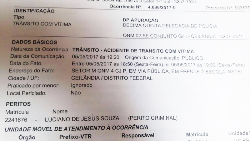 O policial militar Cláudio Pereira dos Santos, por enquanto definido supostamente como um mero desastrado, foi levado ao Hospital Regional de Ceilândia, após atropelar um ciclista e jogar a motocicleta que pilotava – uma Honda CB, da corporação a que pertence – contra um Fiat Pálio que estava estacionado.