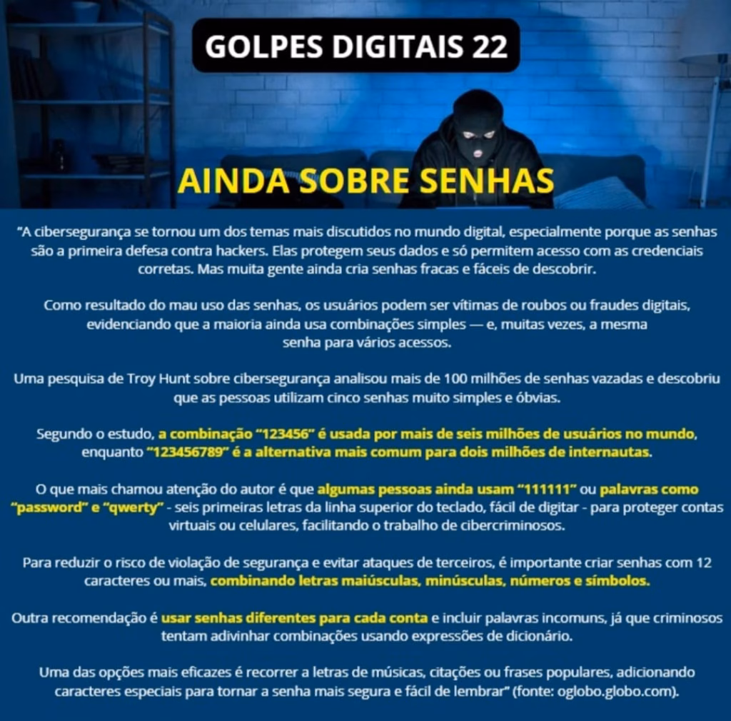 Uma das opções mais eficazes é recorrer a letras de músicas, citações ou frases populares, adicionando caracteres especiais para tornar a senha mais segura e fácil de lembrar” (fonte: oglobo.globo.com).