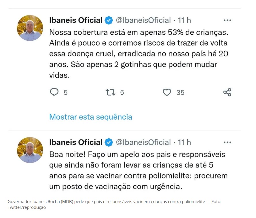 O chefe do Executivo Ibaneis Rocha, do MDB, em sua rede social, nesta quarta, 09, fez um apelo para que pais e responsáveis vacinem crianças contra a poliomielite, doença infectocontagiosa transmitida por um vírus que causa paralisia infantil.