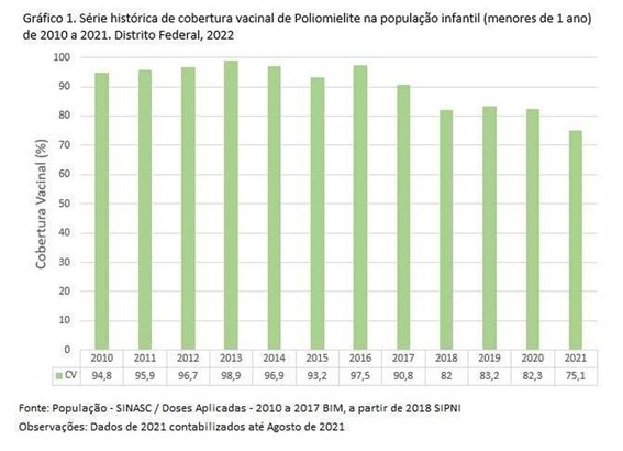 Veja a série histórica da cobertura vacinal contra poliomielite no DF: