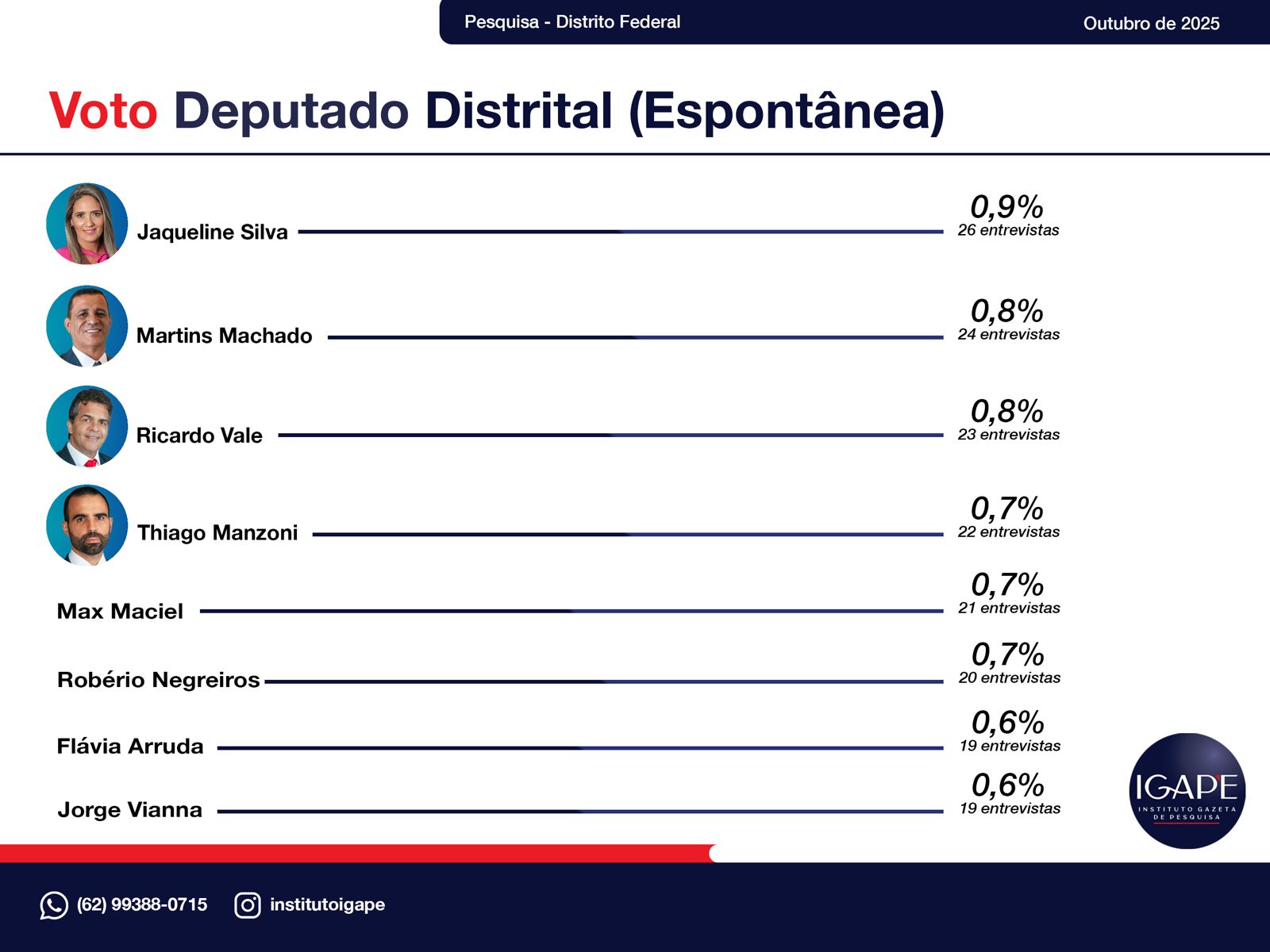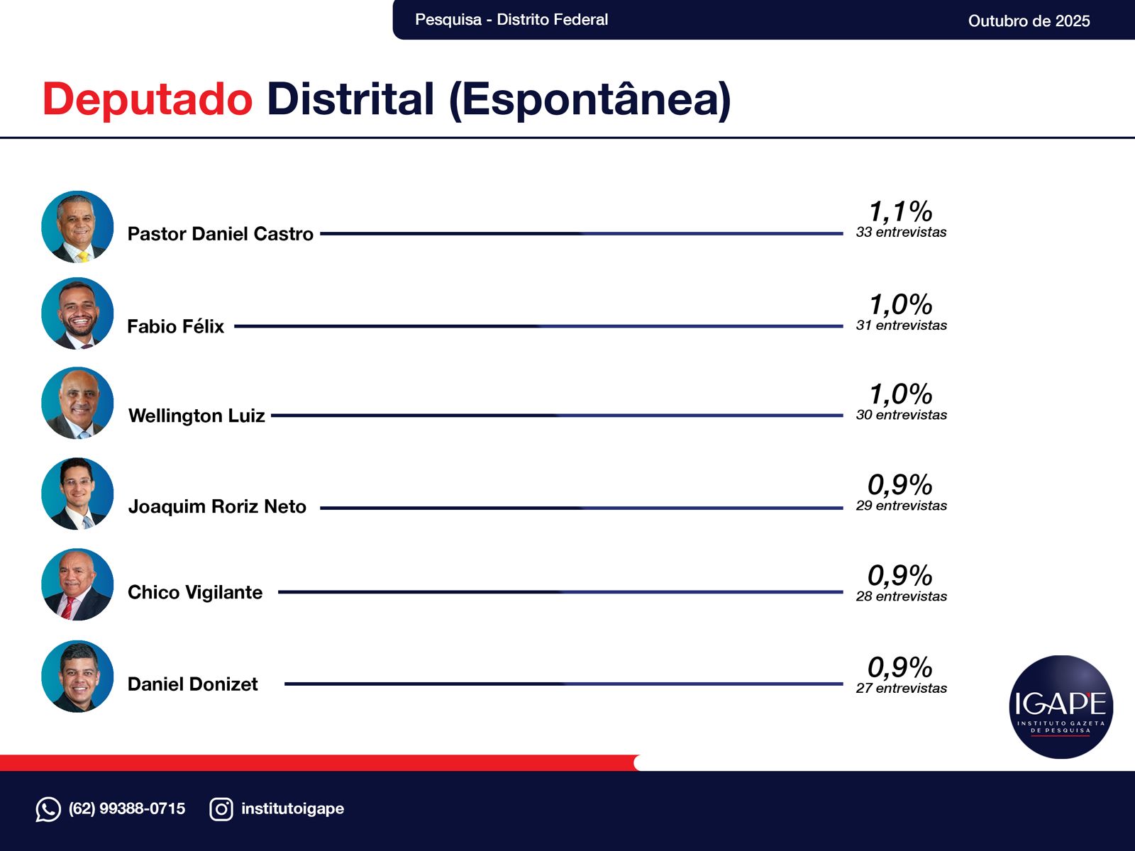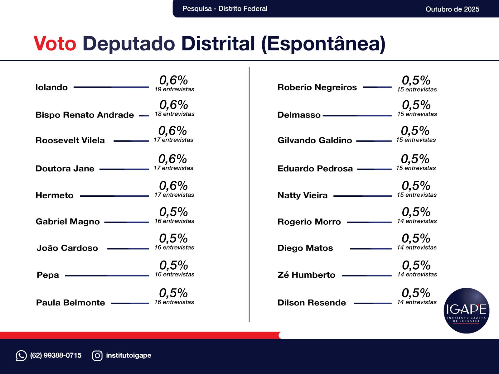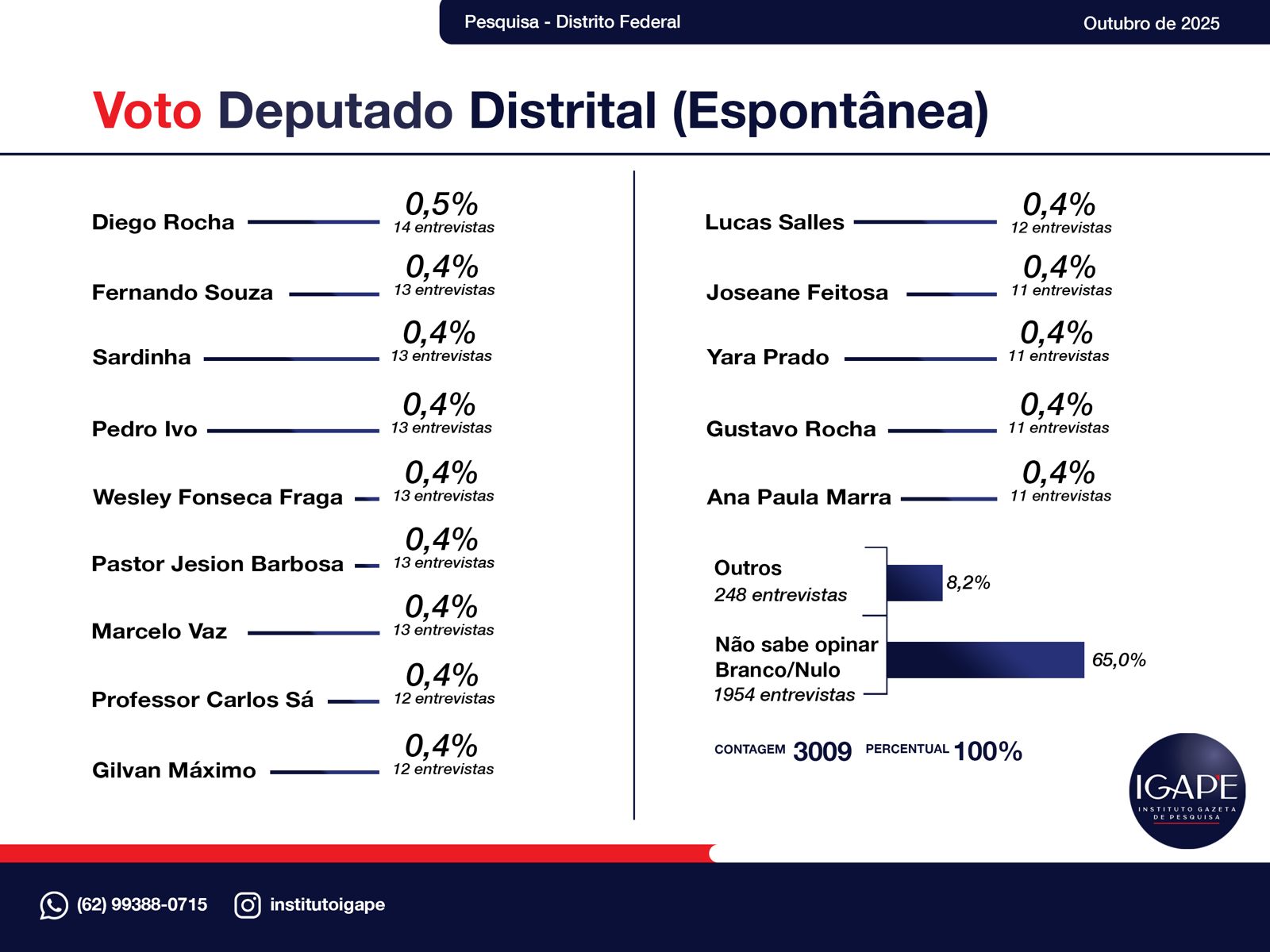 O Instituto Gazeta de Pesquisas (IGAPE) divulgou, em outubro de 2025, o mais recente levantamento sobre as intenções de voto espontâneas para Deputado Distrital no Distrito Federal