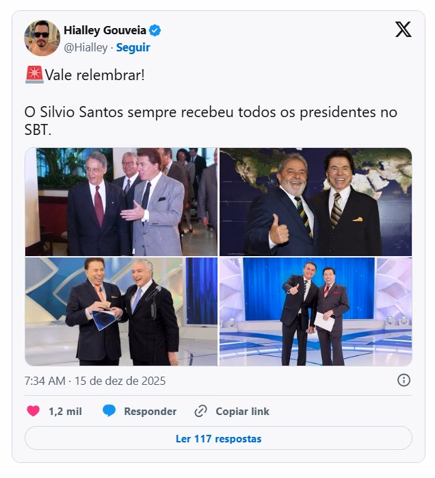 A participação do presidente Luiz Inácio Lula da Silva (PT) e de outras lideranças políticas no evento de lançamento de um novo canal do SBT provocou forte repercussão nas redes sociais e reacendeu debates sobre a relação histórica da emissora com o poder público. Diante da controvérsia, internautas passaram a resgatar imagens e registros antigos de Silvio Santos ao lado de ex-presidentes da República.