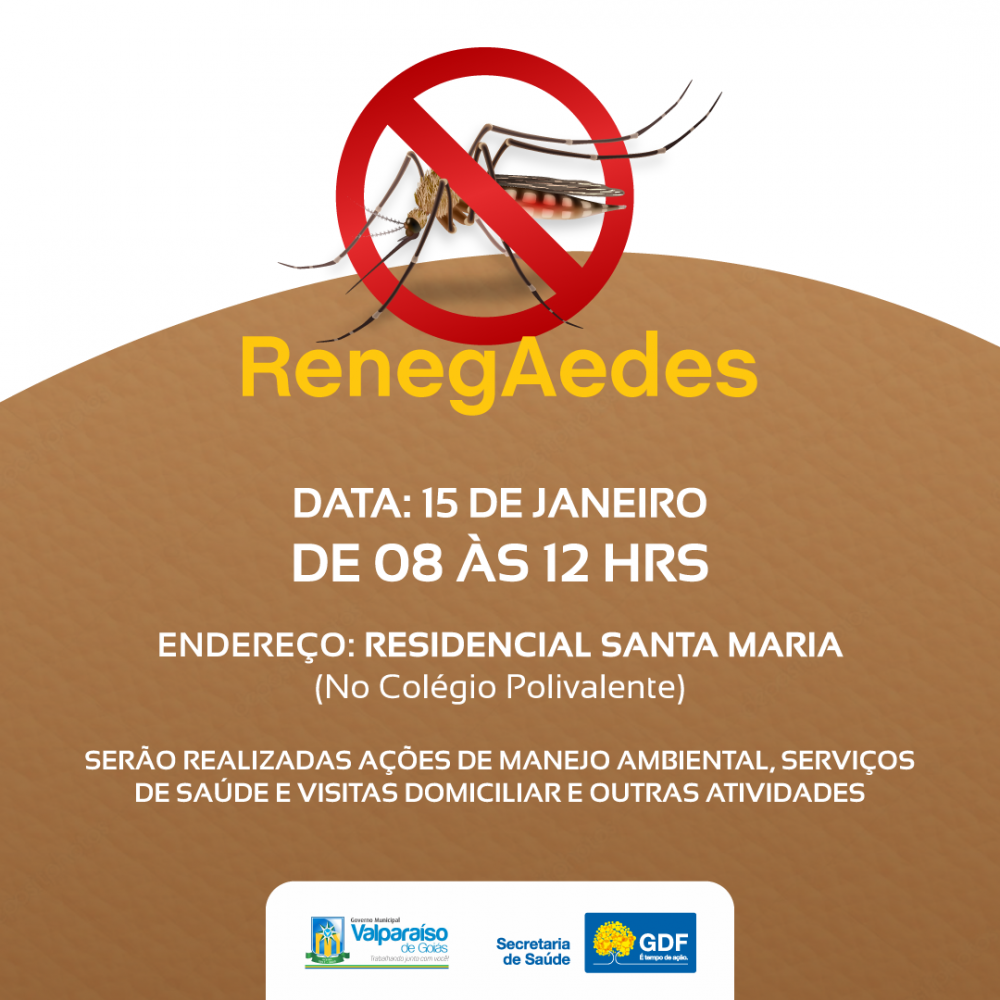 O Residencial Santa Maria, próximo ao município de Valparaíso de Goiás, recebe na quarta-feira, dia 15 de janeiro, o “RenegAedes”.