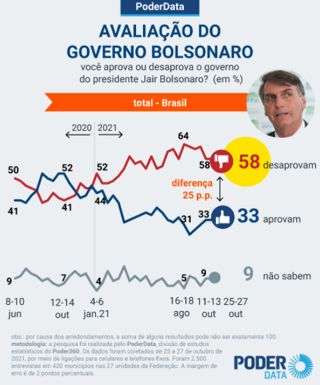 Esta pesquisa foi realizada no período de 25 a 27 de outubro de 2021 pelo PoderData, a divisão de estudos estatísticos do Poder360. Foram 2.500 entrevistas em 420 municípios nas 27 unidades da Federação. A margem de erro é de 2 pontos percentuais, para mais ou para menos.